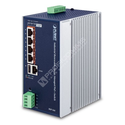 Planet BSP-360: "IP30 Industrial Renewable Energy 4-Port 10/100/1000T 802.3at PoE+ Managed Ethernet Switch/Router (-10 to 60 degree C, 4-Port Gigabit 802.3at PoE+ injector + 1-Port Gigabit Ethernet; 24V/1A DC output, Web management, 400-watt PV power input, MPPT bat